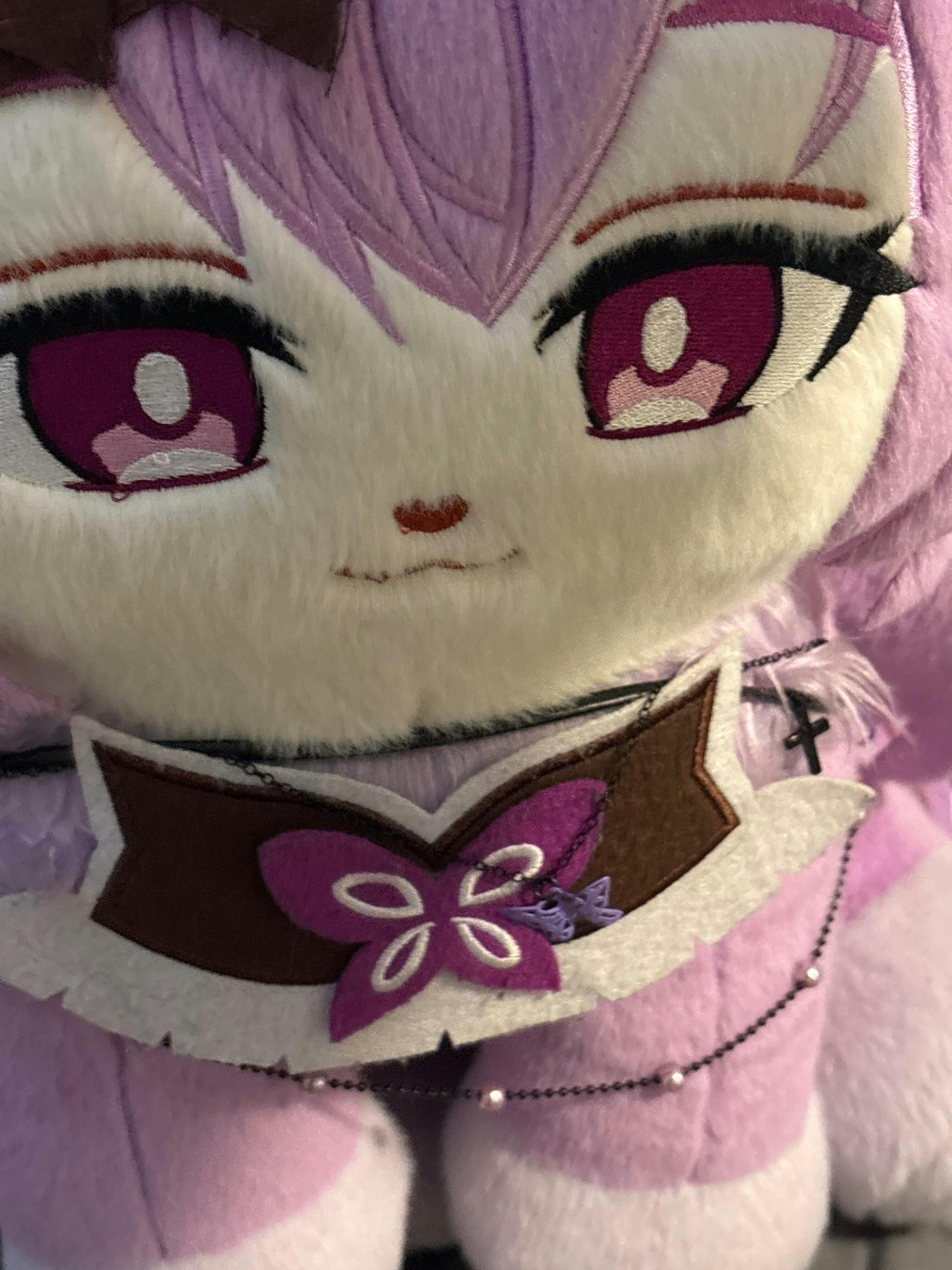She's made with very soft fabric, and her hair design is so beautiful. Of the over 20 meows I own now, she and Alucard are the most beautiful meows I have in my opinion. The only thing I dont like is that her little flower crown is flattened during the vacuum sealing process and after over a month of receiving her, it still hasnt gone straight. Also the butterfly on the back of her hair hasnt been glued on properly either so I had to fix that as well. She's one of the bigger meows. On the pictures you can see she's a bit bigger than Phainon and Mydei meow for example.